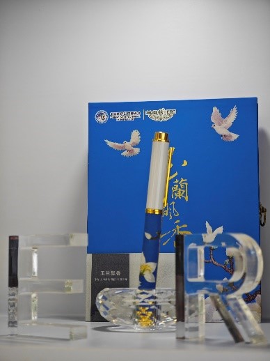 苏绣系列18K金笔——玉兰飘香(左一),由英雄与中国工艺美术大师姚建萍老师联合创新的苏绣系列,该图汲取自首届进博会迎宾厅的大型苏绣作品《玉兰飘香》。